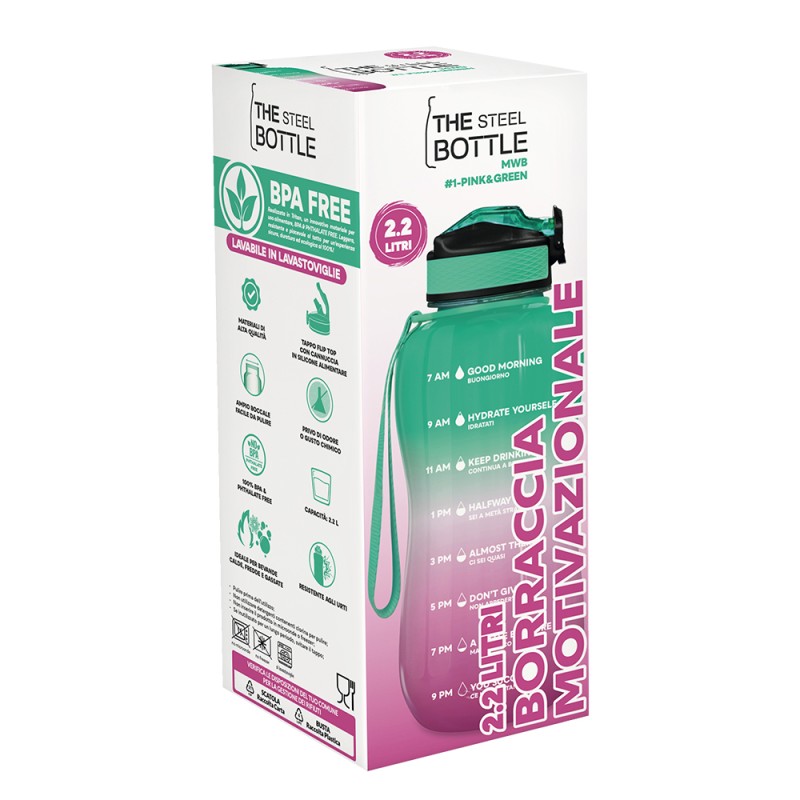 Die The Steel Bottle Motivationsflasche besteht aus innovativem Tritan, einem leichten, robusten und BPA- & Phthalat-freien Material. Dank der Motivationssprüche in Italienisch und Englisch sowie den stündlichen Markierungen behältst du deine Flüssigkeitsaufnahme den ganzen Tag über im Blick – so wird es einfacher denn je, genug Wasser zu trinken.